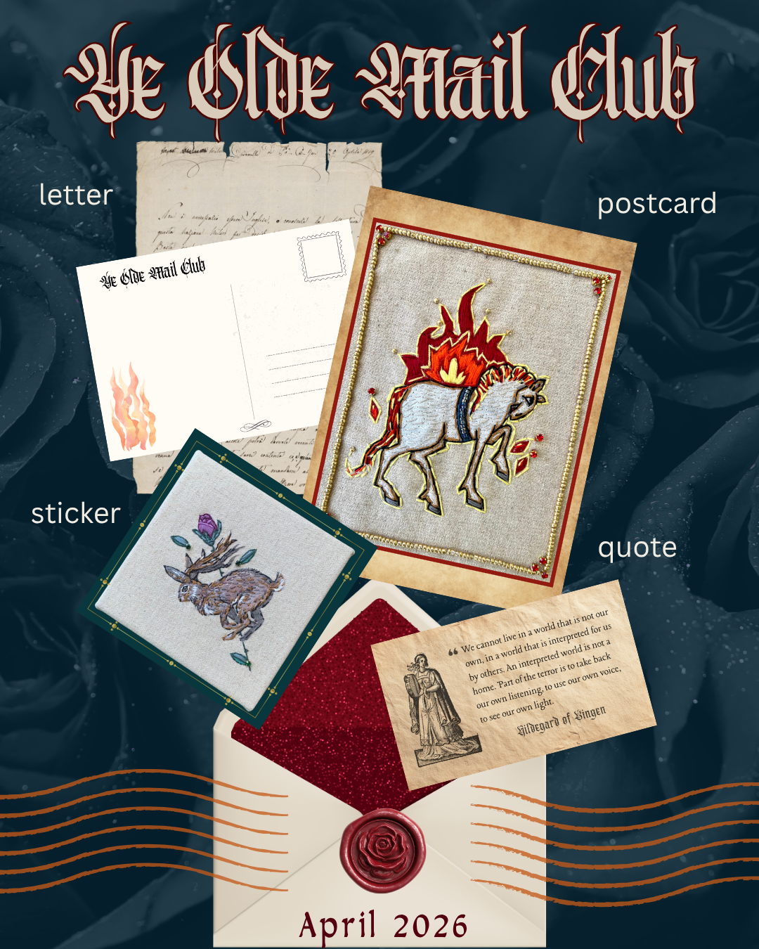 YE OLDE MAIL CLUBIntroducing a Snail Mail Art ClubInspired by Medieval Marginalia UPCOMING ART SHOWSCOVENANT GALLERYTEXTILES GROUP SHOWMay 21-June 2, 2026SOLO SHOWJune 3-10, 2026 EVENTS The Wellington Embroiderers’ Guild MeetingWednesday, June 10th, 2026: 7:30pm PRESS Interview in Voyage LA